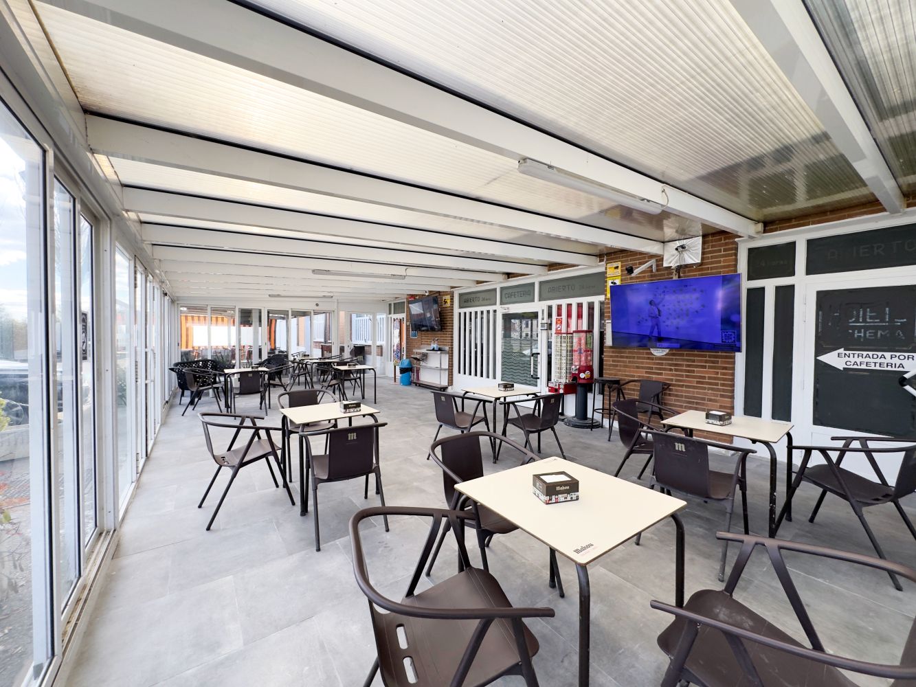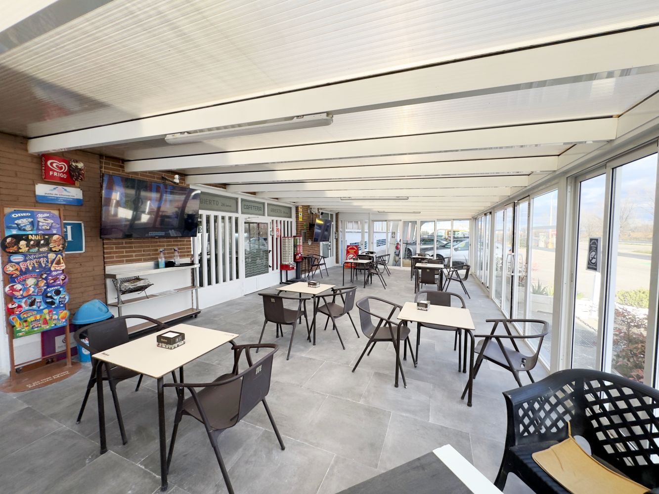 Además, en nuestro Restaurante-Bar abierto 24 horas todos los días, encontrará amplios salones climatizados donde podrá disfrutar de comida casera, menús diarios —también en festivos—, comidas de empresa y meriendas con menús concertados, en un ambiente cómodo y acogedor, con cuenta con varias pantallas de gran formato para disfrutar de retransmisiones deportivas tanto en el comedor, el bar o las terrazas.