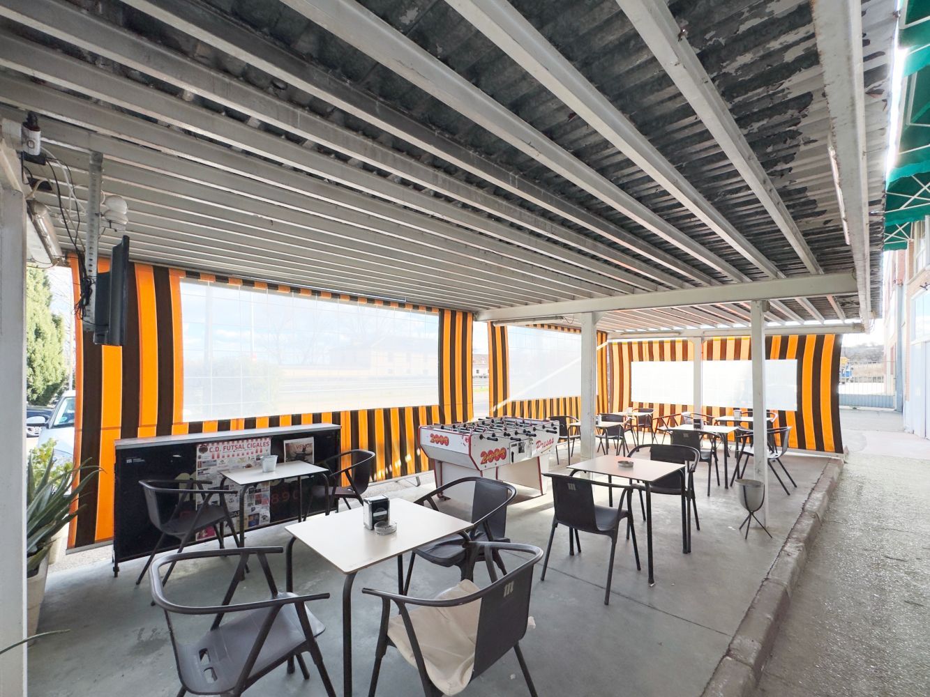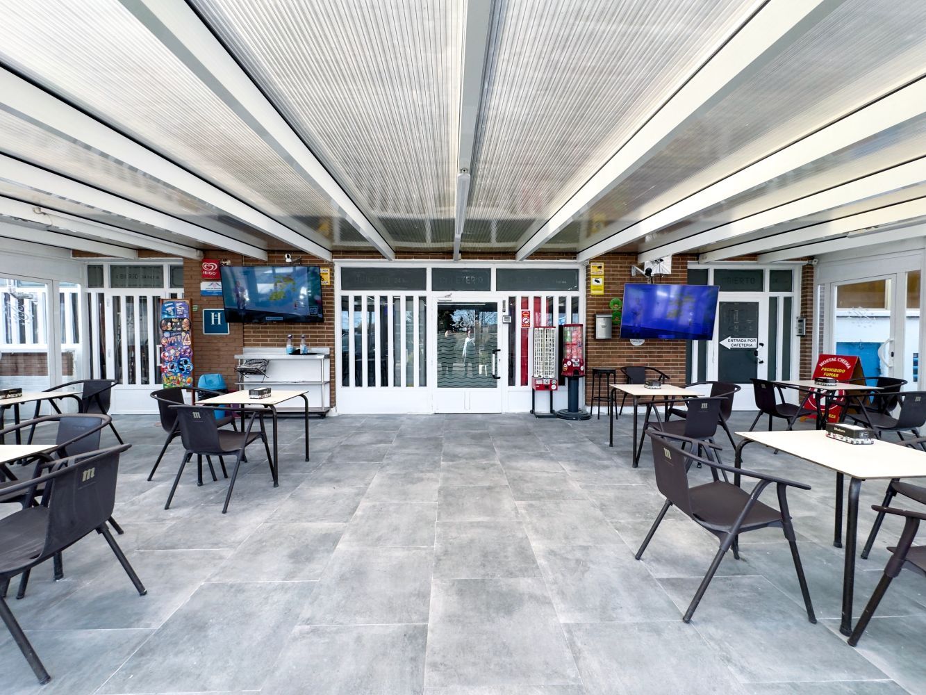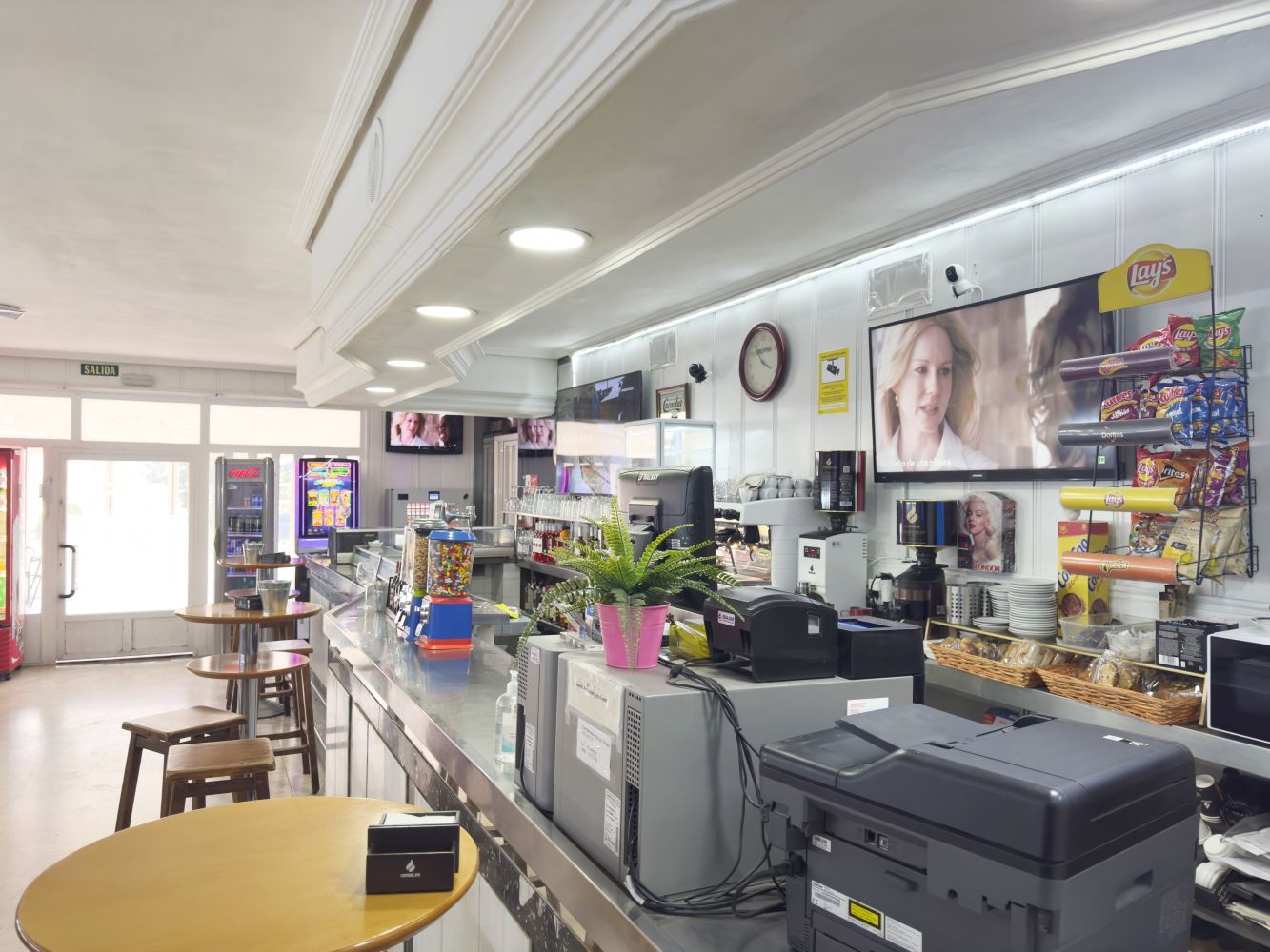 La cafetería, abierta 24 horas, cuenta con varias pantallas de gran formato para disfrutar de retransmisiones deportivas en un ambiente cómodo y animado. Además, disponemos de una terraza acristalada con mamparas correderas, que permite su uso durante todo el año: cerrada en invierno con estufas y abierta en verano, ofreciendo un espacio agradable y versátil. Tanto en el interior como en la terraza, podrá seguir los principales eventos deportivos y taurinos con total comodidad.