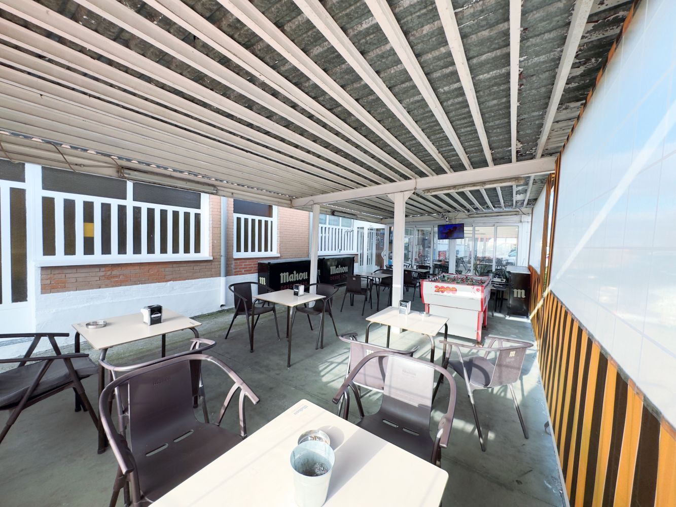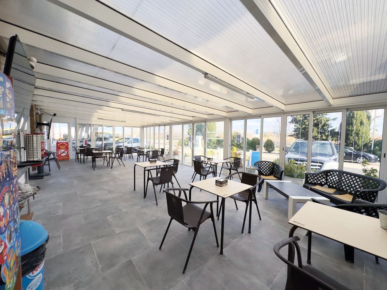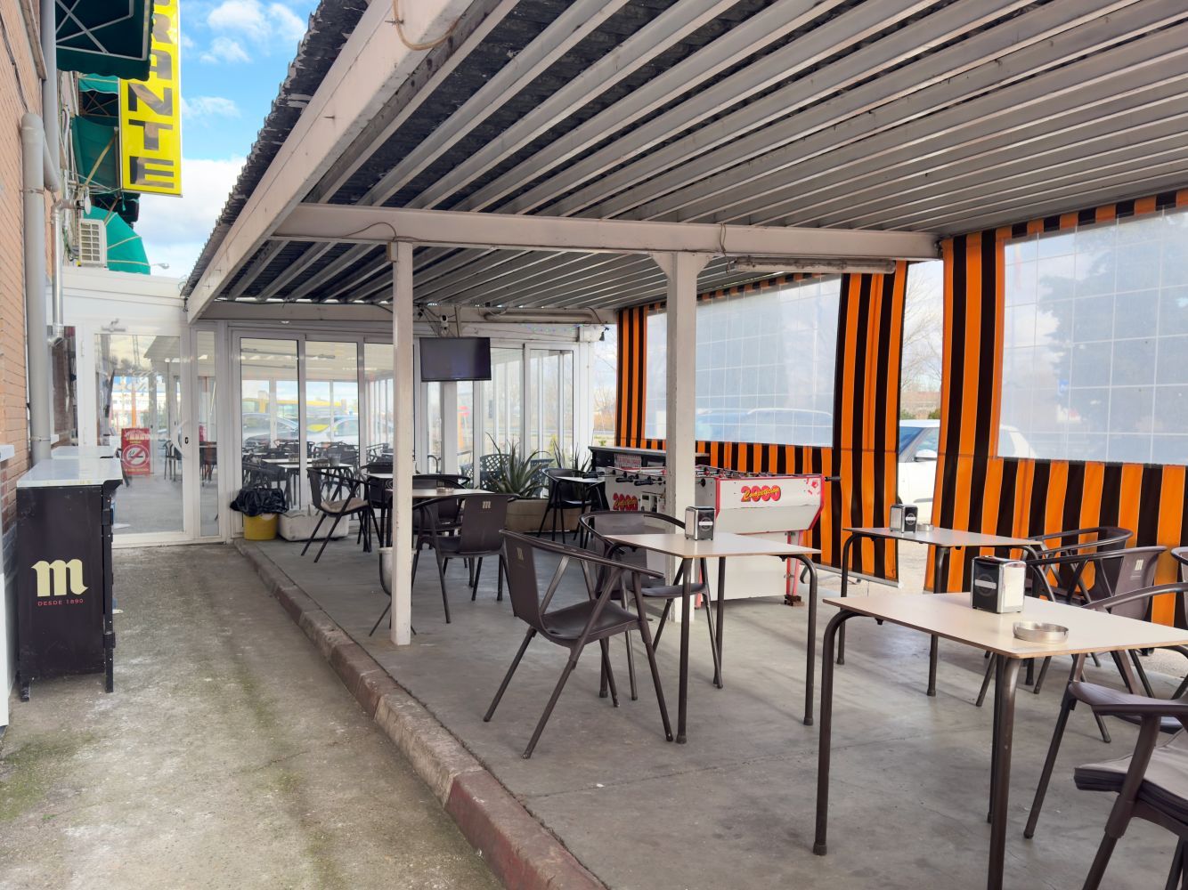 La cafetería, abierta 24 horas, cuenta con varias pantallas de gran formato para disfrutar de retransmisiones deportivas en un ambiente cómodo y animado. Además, disponemos de una terraza acristalada con mamparas correderas, que permite su uso durante todo el año: cerrada en invierno con estufas y abierta en verano, ofreciendo un espacio agradable y versátil. Tanto en el interior como en la terraza, podrá seguir los principales eventos deportivos y taurinos con total comodidad.
